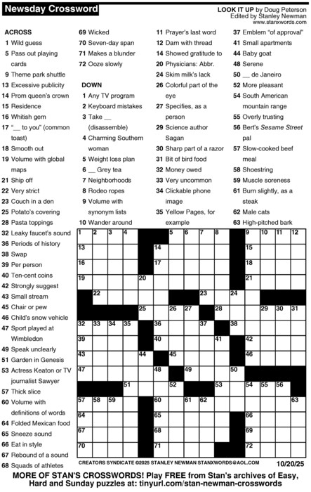 Because free access to the content of Newsday.com is available only to Newsday subscribers and customers of Cablevision (Newsday’s owner), many thousands of puzzle fans, spanning six continents, get the Newsday Crossword free every day right here at Stan’s Crossword Land.