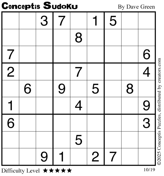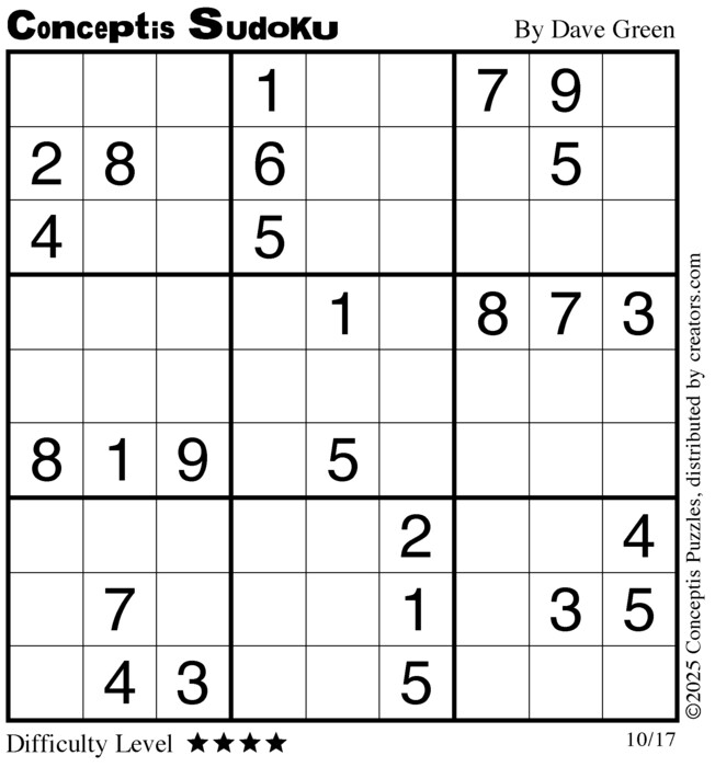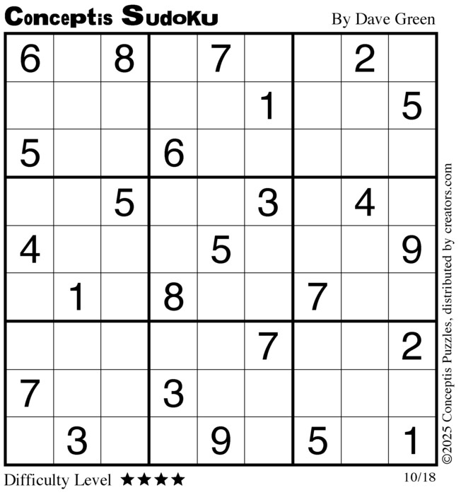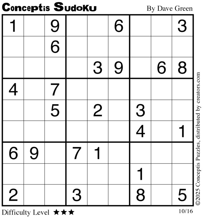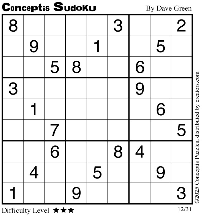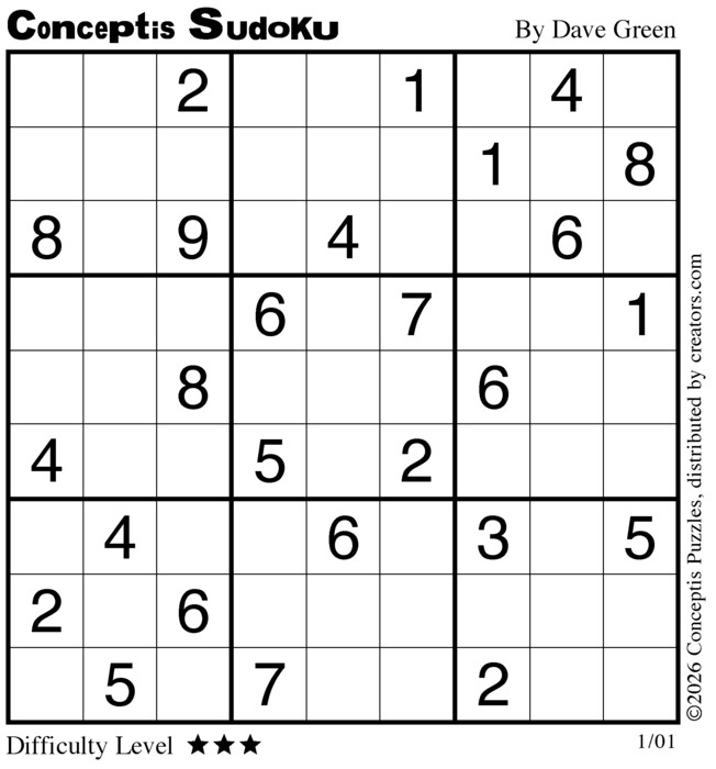 Each puzzle consists of a 9x9 grid containing given clues in various places. The object is to fill all empty squares so that the numbers 1 to 9 appear exactly once in each row, column and 3x3 box.